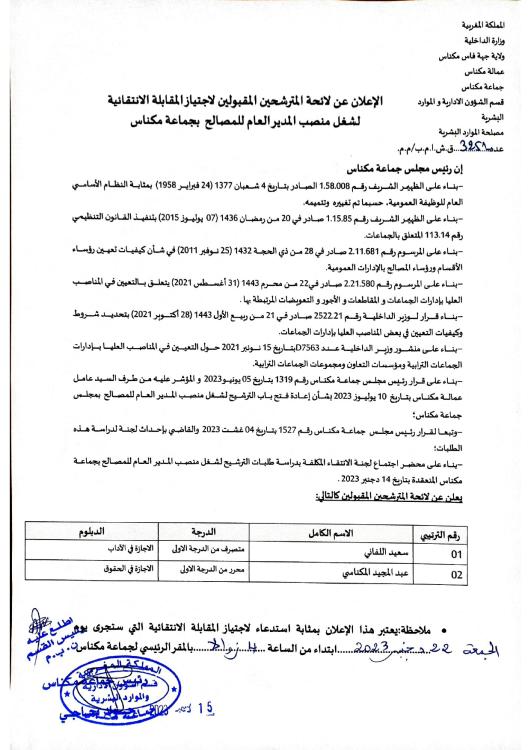 الإعلان عن لائحة المترشحين المقبولين لاجتياز المقابلة الانتقائية لشغل منصب المدير العام للمصالح بجماعة مكناس