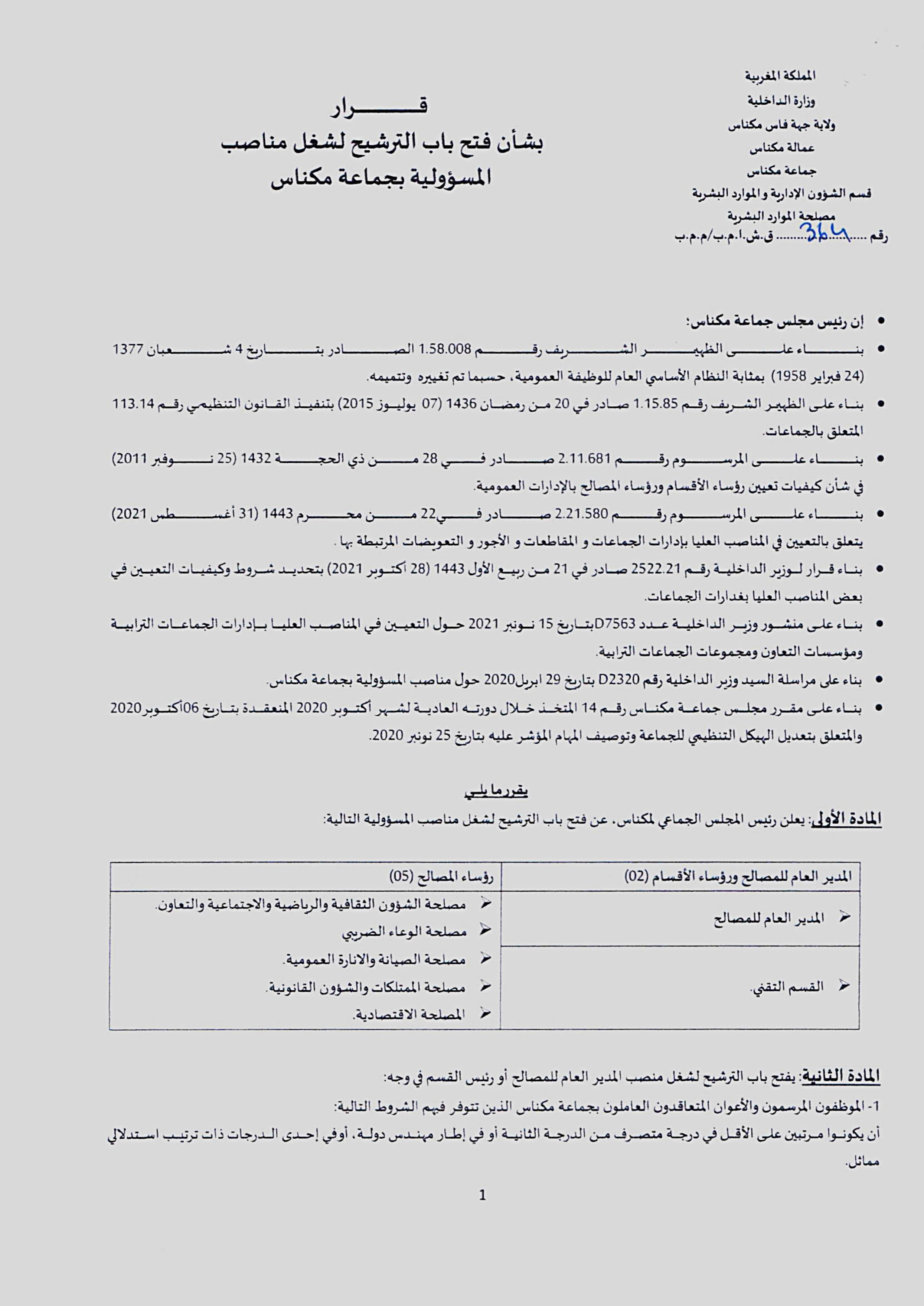 قرار فتح باب الترشيح لشغل مناصب المسؤولية