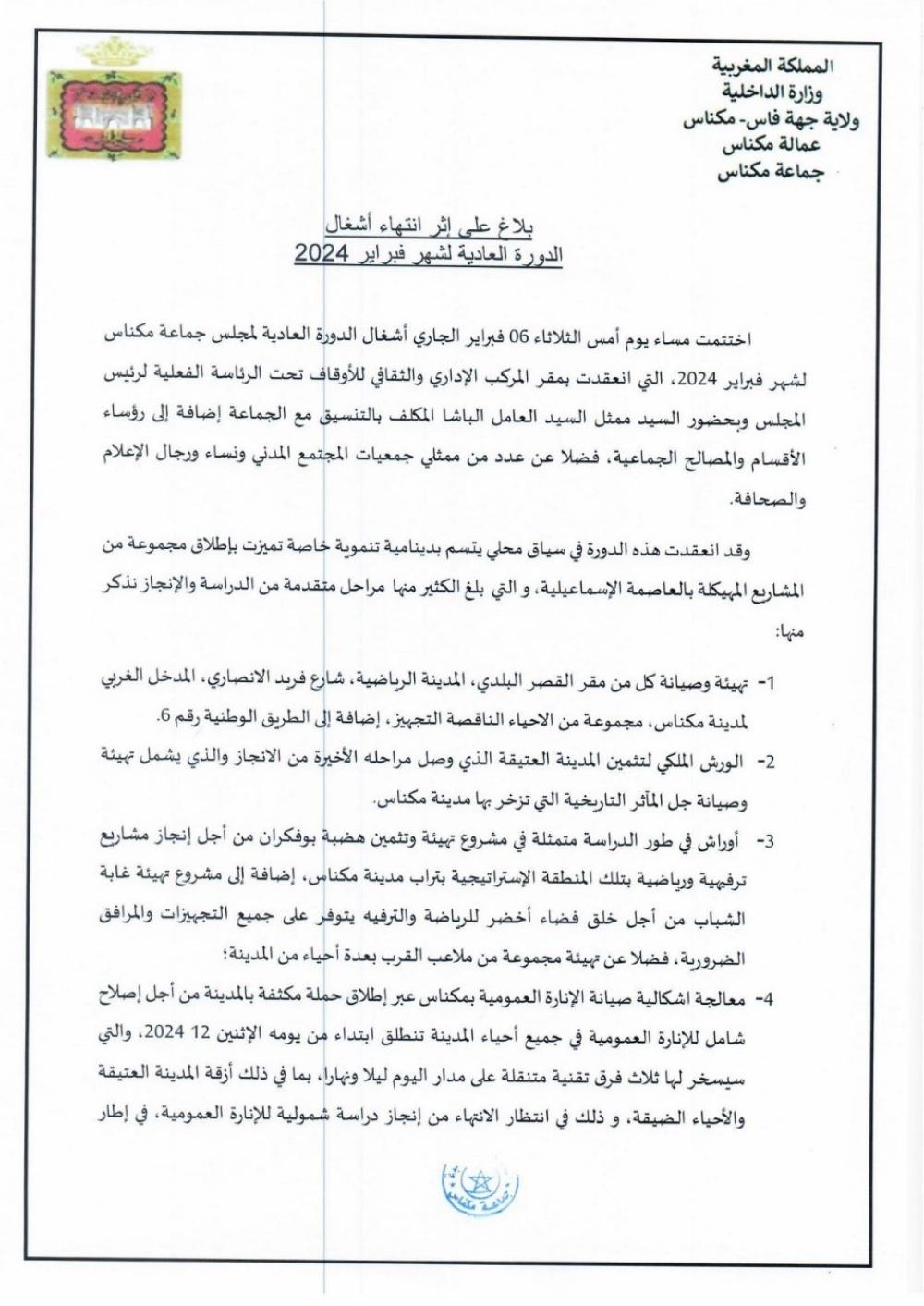 بلاغ على إثر انتهاء أشغال الدورة العادية لشهر فبراير 2024